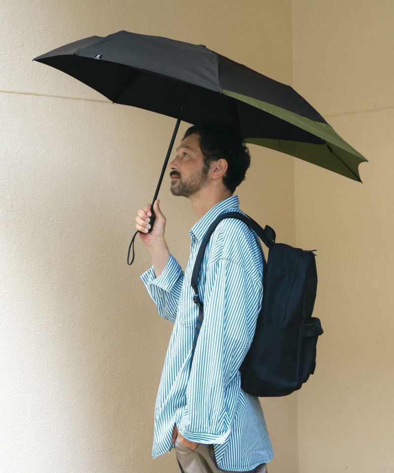 折りたたみ時のコンパクトさはそのままに、傘を開くと骨の一部が後方に伸びる特殊構造で、背負ったバックパックを雨から守ります。