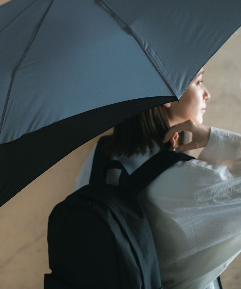 折りたたみ時のコンパクトさはそのままに、傘を開くと骨の一部が後方に伸びる特殊構造で、背負ったバックパックを雨から守ります。