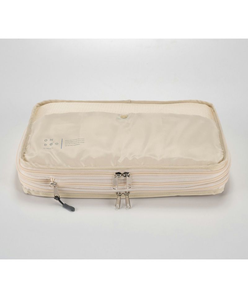 ファスナーを閉めるだけで厚みを減らせる、旅行のパッキングに便利なポーチです。