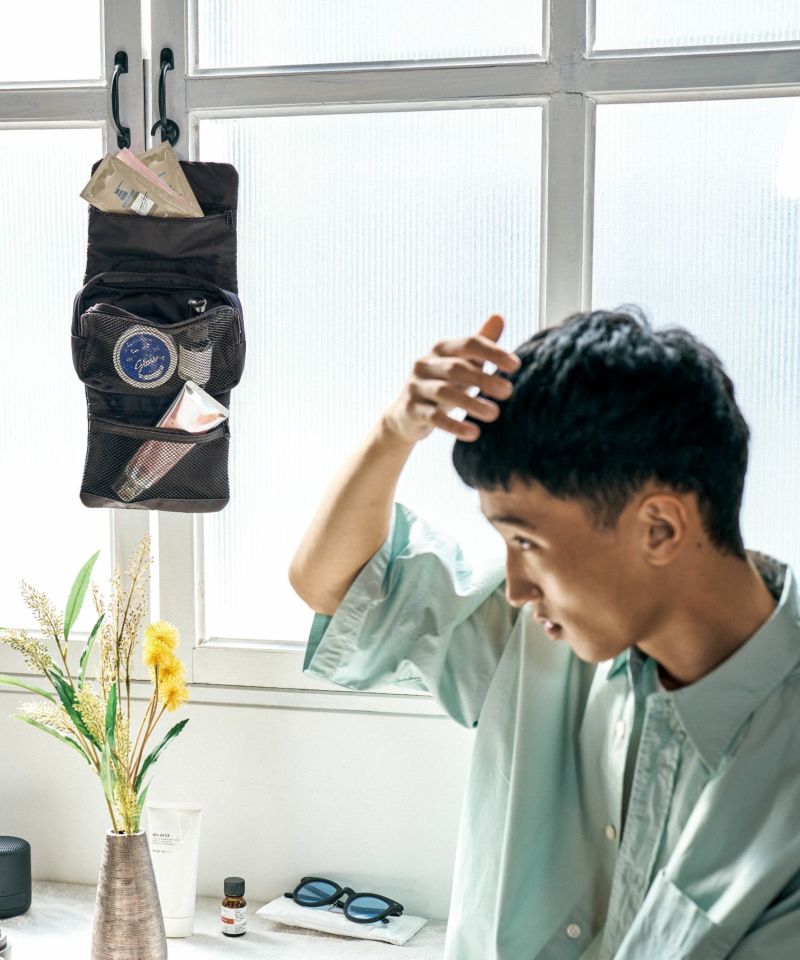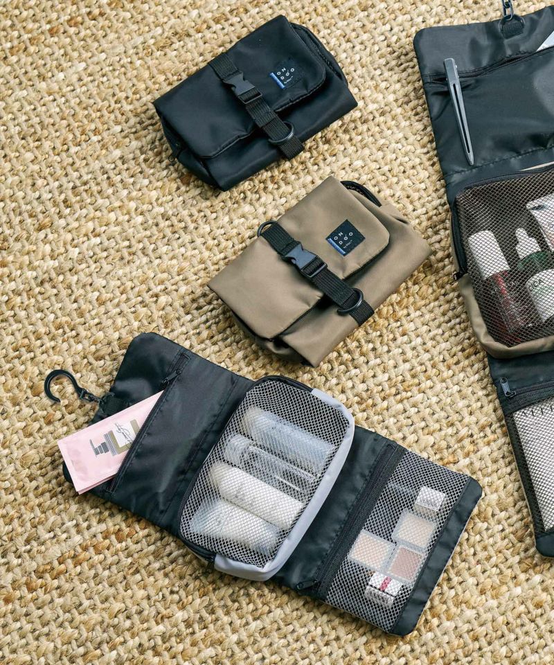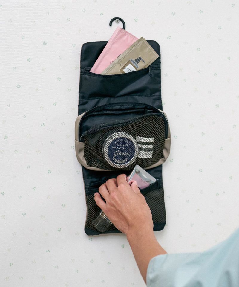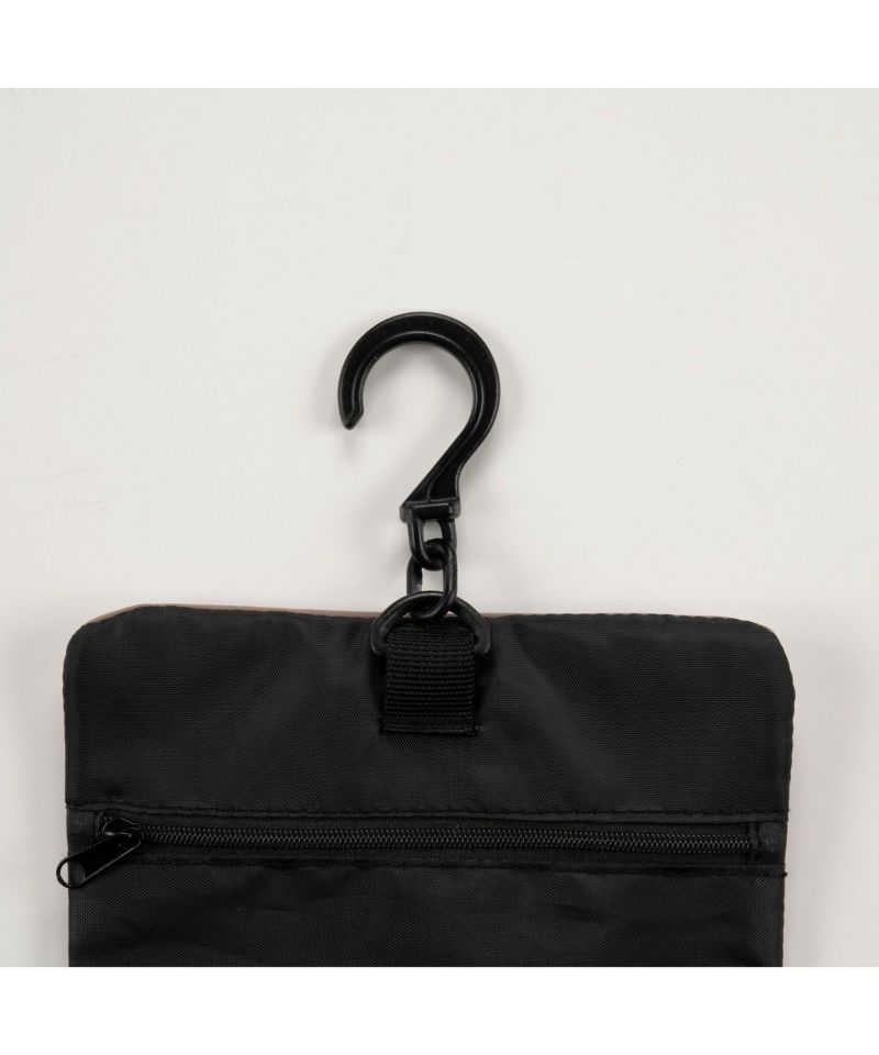 トラベルセットをまとめて収納できる、フック付きポーチ。