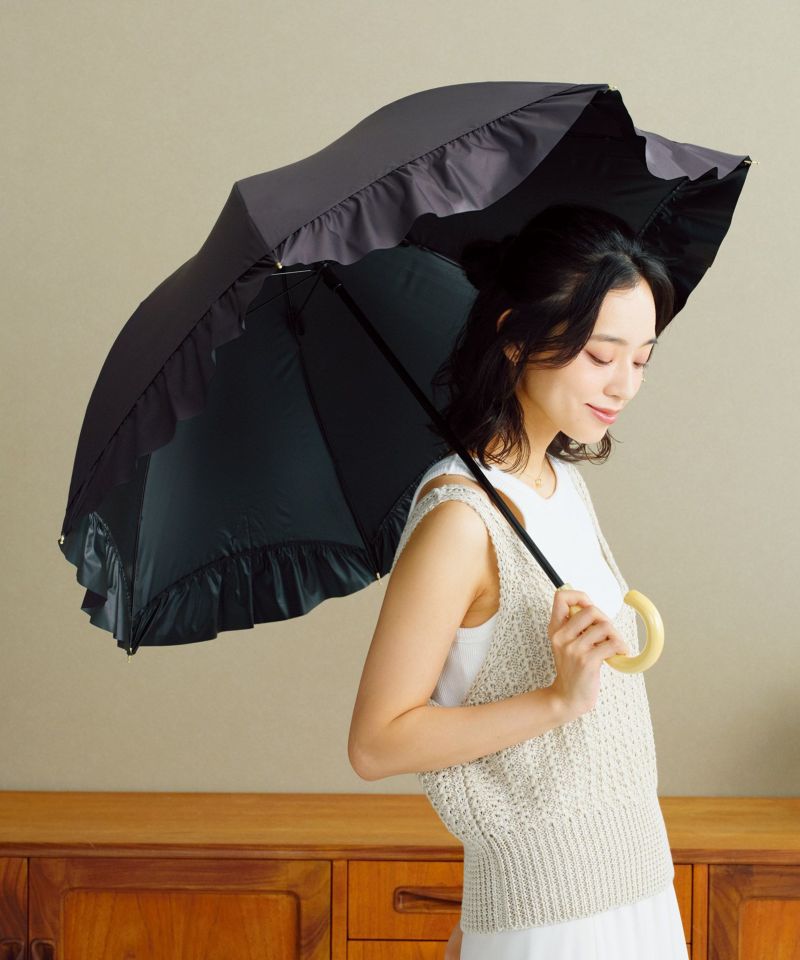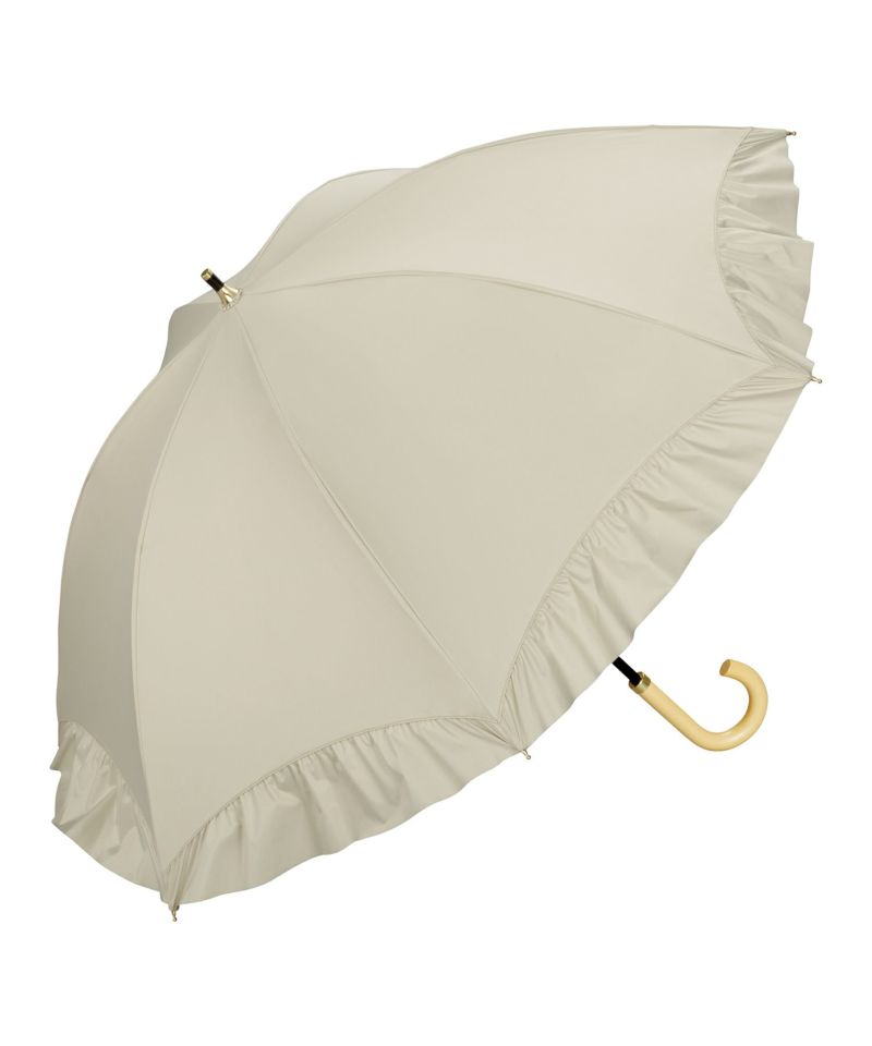 華やかで大きめのフリルを裾全体にあしらった、女性らしく上品な長日傘。