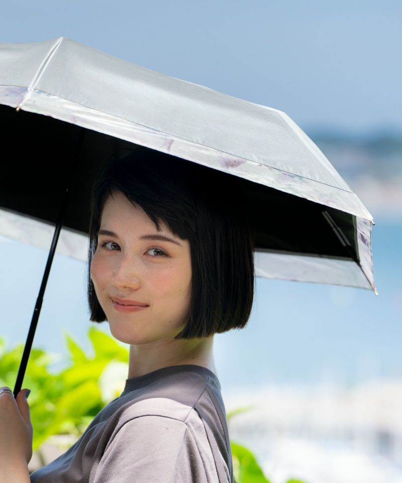 オーガンジー生地がポイントになりながらも、派手になりすぎないテイストの柄なので、どんなファッションにも合わせやすい日傘です。