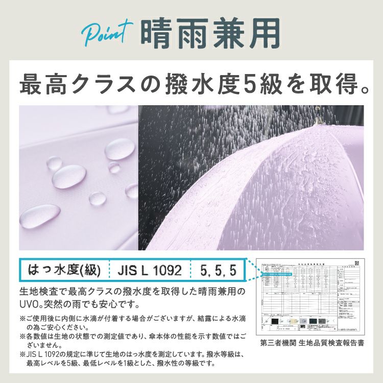 雨傘と同等の撥水性を要求し、最高クラスの撥水度5級(※)を取得しました。