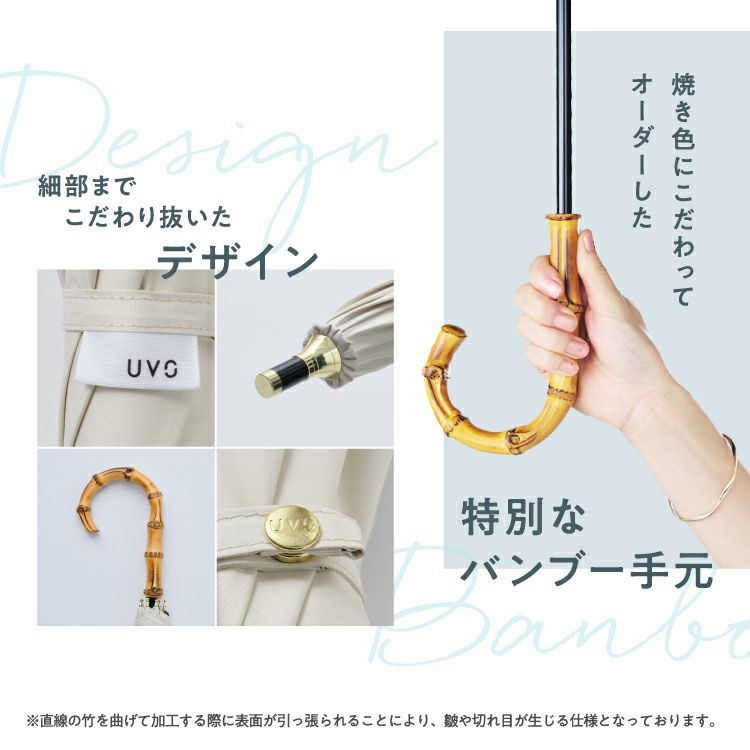 UVOには焼き色にこだわってオーダーした、特別なバンブー手元を使用しています。バンブー手元は直線の竹を曲げて加工しているため、表面が引っ張られることにより、皺や切れ目が生じる仕様となっております。天然素材ならではの1本ごとに異なる形や節の表情をお楽しみください。