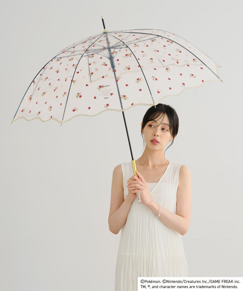 ポケモンとハートが散りばめられた可愛らしいデザインのビニール傘。