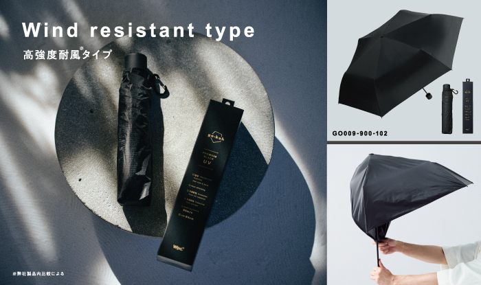 Wpc. 史上初めて耐風30m/sの耐風試験に合格した、高強度の骨を採用。風を受けても変形しにくく、折れずに元の形に戻ります。